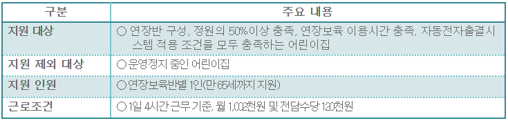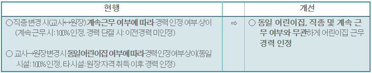 ○ 겸임 제한 규정 개선 - (개정취지) 보육지원체계 개편에 따른 연장교사 배치를 위한 겸임 제한규정 개선 - (주요내용) 보조교사, 야간연장보육교사는 연장보육교사 겸임 가능 ○ 육아기 단축근무 대체인력 배치 규정 신설 - (개정취지) 일·가정 양립을 지원하기 위하여 담임교사의 육아기 근로시간단축 근무 시 대체인력 배치 규정 마련 - (주요내용) 담임교사의 육아기 근로시간단축 근무 시 신규채용 및 기존 인력(다른 반 담임교사, 보조교사, 연장보육교사 등)을 활용, 배 < 보육교직원 인건비 지원 > ○ 호봉인정기준 개선 - (개정취지) 보육교직원 직종변경, 휴직 등에 따른 호봉인정 상 불이익 해소 - (주요내용) 직종변경 시 계속근무여부 및 동일 어린이집여부에 따른 호봉인정 상의 불이익 해소