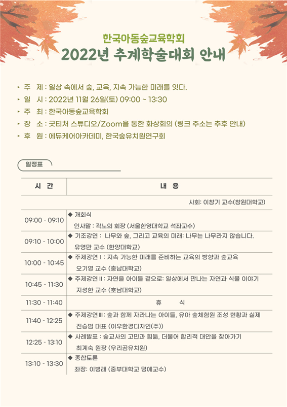[한국아동숲교육학회] 2022년 추계학술대회 안내 2022.11.18 |