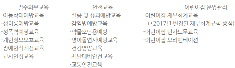 에듀케어아카데미입니다. 어린이집 보육교직원의 전문성 강화를 위해, 보육사업안내 및 관련 법령과 평가인증 등에서 의무적으로 보육교직원이 이수해야 할 교육을 규정하고 있습니다. 이에 보육교직원 여러분께서 교육이수와 이수증 발급, 이수 경력관리를 에듀케어아카데미에서 하실 수 있도록 필수의무교육, 안전교육 등의 특강을 개설하여 운영하고 있으니 보육교직원의 직무능력 향상과 어린이집의 효율적인 운영에 도움이 되길 바랍니다. ▣ 보육교직원 특강 ![]() ▣ 교육 이수 인정 ![]() •인성교육 (평가인증 통합지표) [3-3-3] 영유아와 교직원의 건강 증진을 위한 예방관리와 교육을 실시한다. - 교직원의 직무스트레스(정신건강)를 예방하고 관리할 수 있는 서비스를 안내하거나 제공한다. ※ 현재, 유 ·초 교원의 경우 인성교육진흥법에 따라 연간 4시간 이상 인성 교육을 실시한다. 건강증진 및 예방관리 •평가인증 통합지표 [3-3-3] 영유아와 교직원의 건강 증진을 위한 예방관리와 교육을 실시한다. - 영유아 및 교직원을 대상으로 다양한 건강 및 영양교육을 실시한다. - 교직원의 직무스트레스(정신건강)를 예방하고 관리할 수 있는 서비스를 안내하거나 제공한다. 전문성 •평가인증 통합지표 [4-1-1] 원장은 자신의 전문성 향상을 위해 노력하고 있다. [4-4-2] 교사의 전문성 제고를 위한 다양한 연수 기회를 부여하고 있다. ※ 상기 내용은 관련법 개정 및 교육기관의 상황에 따라 변경될 수 있습니다. ※ 첨부자료: 첨부해드린 의무교육 안내는 어린이집 운영 시 도움을 드리고자 참고사항으로 작성했으며, 관련법 개정이나 교육기관의 상황에 따라 변동될 수 있습니다. 자세한 사항은 보육사업안내를 참고하시기 바랍니다. ▣ 이수증 발급 로그인 > 나의 강의실 > 증명서 발급 > 해당 이수증 출력하기 |
