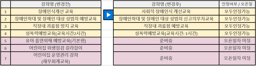 안녕하세요. 에듀케어아카데미입니다. 에듀케어의 보육교직원 특강을 이용해 주시는 분들께 특강관련 안내드립니다. 4월 10일자로 보육교직원 특강 변경사항이 있습니다. 1. 강좌명칭 변경 2. 기존 제공되던 강좌 새롭게 리뉴얼 준비중 아래의 내용을 참고해 주시고, 준비중인 강좌는 최대한 빠른시일내에 오픈할 수 있도록 노력하겠습니다. (※ 명칭이 변경된 강좌를 이전에 수강 하셨던 분들은 다시 재수강 하실 필요는 없습니다. 동일하게 인정됩니다. )