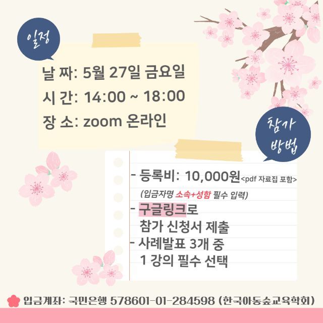 안녕하세요. 에듀케어아카데미입니다. 일상의 풀과 나무에서 놀며 배우다. ‘아이, 자연, 교사’가 만드는 행복한 하모니를 실천 사례와 함께 나누며 현장 적용력을 높이는데 도움이 되고자 춘계학술대회를 개최합니다. 양질의 보육환경을 구축하는 데 앞장서가고자 에듀케어아카데미가 후원을 진행합니다. ▶온라인 춘계학술대회 지금 바로 신청하기 https://forms.gle/kGnuZ2E6F92x7TQu5 (접수기간 : ~ 05월 25일) [학술대회 일시 및 개요] □ 주제 : 아이, 자연, 교사의 행복한 하모니 : 일상의 풀과 나무에서 놀며 배우다 □ 일시 : 2022년 05월 27일(금) 14:00 ~ 18:00 □ 주최 : 한국아동숲교육학회 □ 장소 : 굿티처스튜디오(온라인 개최) □ 후원 : 에듀케어아카데미 □ 자료집 다운로드 및 이수증 발급안내 * 5월 26일 목요일 오픈예정 * □ 등록안내 참가비 : 10,000원(자료집 pdf포함) 국민은행 578601-01-284598 예금주 한국아동숲교육학회 *입금자명 반드시 이름 + 소속 예) 김아동 숲어린이집 ☎ 문의 - 정세희 간사 010-2442-1098 / k-forest-edu@naver.com ※ 학술대회 세부일정 및 학술대회 등록방법은 하단의 첨부된 파일을 확인해주세요. ![]() ![]() ![]() |