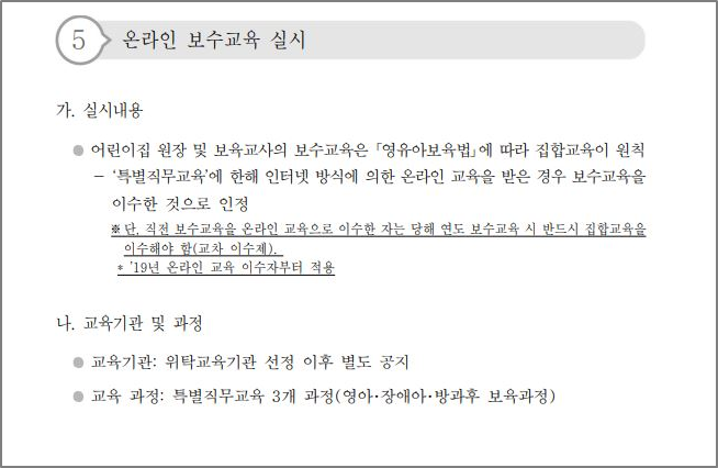 온라인 보수교육 실시 내용이 2020년 보육사업안내에 따라 교차이수제를 적용하는 것으로 변동 되었으며 아래 사항을 참고하셔서 교육 진행에 차질 없으시기를 바랍니다. [변경사항] * 직전 보수교육을 온라인 교육으로 이수한 자는 다음 보수교육 시 반드시 집합교육으로 이수해야 함 (19년 온라인 교육 이수자부터 적용) [예시] 2018년 온라인 보수교육 이수자 → 2021년 온라인 보수교육 이수 가능 2019년 온라인 보수교육 이수자 → 2022년 집합교육 이수 ※ 2018년 온라인 보수교육 이수자는 2021년 온라인보수교육 신청이 가능하오니 착오 없으시기 바랍니다. ![]() (출처 : 2020년 보육사업안내 243P) |