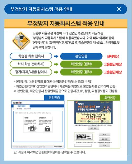 안녕하세요. 에듀케어아카데미입니다. 노동부 지원규정 개정에 따라 산업인력공단에서 제공하는 ‘부정방지 자동화시스템’이 적용되었습니다. 이에 따라 아래와 같이 ‘본인인증’ 및 ‘화면인증(캡챠)’ 완료 후 학습진행이 가능하오니 적극 협조 및 양해 부탁드립니다.