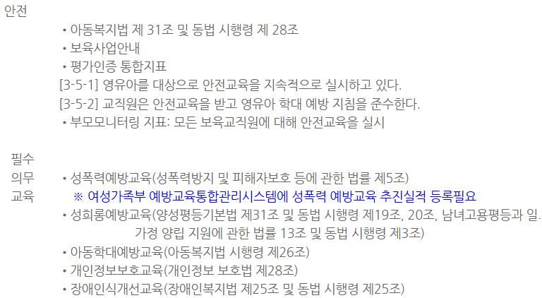 에듀케어아카데미입니다. 어린이집 보육교직원의 전문성 강화를 위해, 보육사업안내 및 관련 법령과 평가인증 등에서 의무적으로 보육교직원이 이수해야 할 교육을 규정하고 있습니다. 이에 보육교직원 여러분께서 교육이수와 이수증 발급, 이수 경력관리를 에듀케어아카데미에서 하실 수 있도록 필수의무교육, 안전교육 등의 특강을 개설하여 운영하고 있으니 보육교직원의 직무능력 향상과 어린이집의 효율적인 운영에 도움이 되길 바랍니다. ▣ 보육교직원 특강 ![]() ▣ 교육 이수 인정 ![]() •인성교육 (평가인증 통합지표) [3-3-3] 영유아와 교직원의 건강 증진을 위한 예방관리와 교육을 실시한다. - 교직원의 직무스트레스(정신건강)를 예방하고 관리할 수 있는 서비스를 안내하거나 제공한다. ※ 현재, 유 ·초 교원의 경우 인성교육진흥법에 따라 연간 4시간 이상 인성 교육을 실시한다. 건강증진 및 예방관리 •평가인증 통합지표 [3-3-3] 영유아와 교직원의 건강 증진을 위한 예방관리와 교육을 실시한다. - 영유아 및 교직원을 대상으로 다양한 건강 및 영양교육을 실시한다. - 교직원의 직무스트레스(정신건강)를 예방하고 관리할 수 있는 서비스를 안내하거나 제공한다. 전문성 •평가인증 통합지표 [4-1-1] 원장은 자신의 전문성 향상을 위해 노력하고 있다. [4-4-2] 교사의 전문성 제고를 위한 다양한 연수 기회를 부여하고 있다. ※ 상기 내용은 관련법 개정 및 교육기관의 상황에 따라 변경될 수 있습니다. ※ 첨부자료: 첨부해드린 의무교육 안내는 어린이집 운영 시 도움을 드리고자 참고사항으로 작성했으며, 관련법 개정이나 교육기관의 상황에 따라 변동될 수 있습니다. 자세한 사항은 보육사업안내를 참고하시기 바랍니다. ▣ 이수증 발급 로그인 > 나의 강의실 > 증명서 발급 > 해당 이수증 출력하기 |