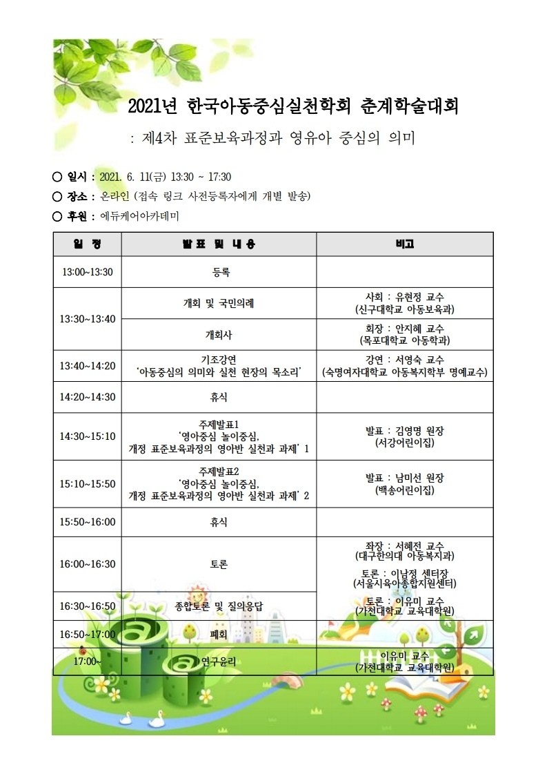 안녕하세요. 에듀케어아카데미입니다. '한국아동중심실천학회'에서 2021년 춘계학술대회가 개최되어 안내드립니다. ■ 주제: 제4차 표준보육과정과 영유아 중심의 의미 ■ 개최일: 2021년 06월 11일 (금) ■ 장소: Zoom을 활용한 온라인 대강의(접속 링크 사전등록자에게 개별 발송) ■ 후원: 에듀케어아카데미 ■ 사전등록기간: 2021. 5. 14(금) ~ 6. 4(금) ■ 참가신청: 신청서를 다운받아 작성하여 child-center@daum.net 발송 ■ 학술대회 안내: http://www.afterschool.or.kr/